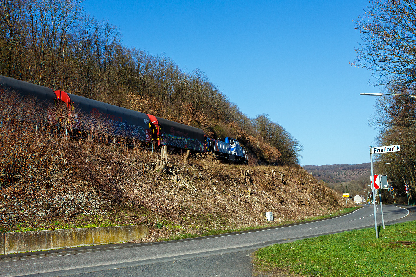 Geführt von der KSW 42 (92 80 1277 902-3 D-KSW), eine Vossloh MaK G 1700 BB, fährt am 19 März 2025 die KSW (Kreisbahn Siegen-Wittgenstein), im Sandwich mit einem schweren Coilzug, von Betzdorf/Sieg in Richtung Herdorf zum KSW-Rangierbahnhof (Betriebsstätte FGE - Freien Grunder Eisenbahn), hier bei Herdorf-Sassenroth. Am Zugschluss die nachschiebende KSW 45 (98 80 0276 016-9 D-KSW) eine MaK G 1204 BB.