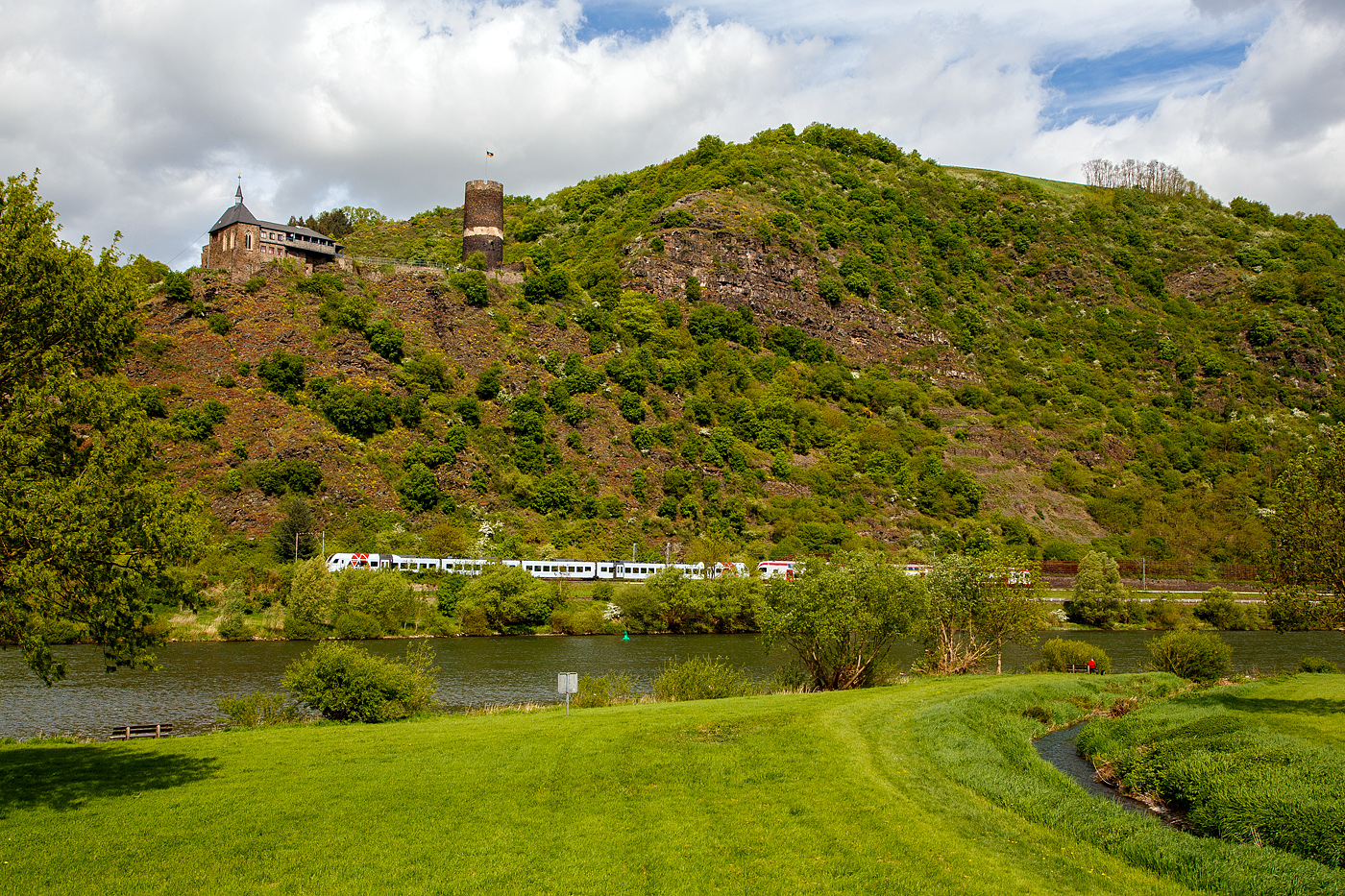 Ein dreiteiliger CFL Stadler KISS als RE 11 "Benelux-Express" gekuppelt mit einem fünfteiligen SÜWEX Stadler FLIRT 3 als RE 1 "Südwest-Express"" fahren am 28 April 2018 zwischen Moselkern und Hatzenport gemeinsam in Richtung Koblenz.