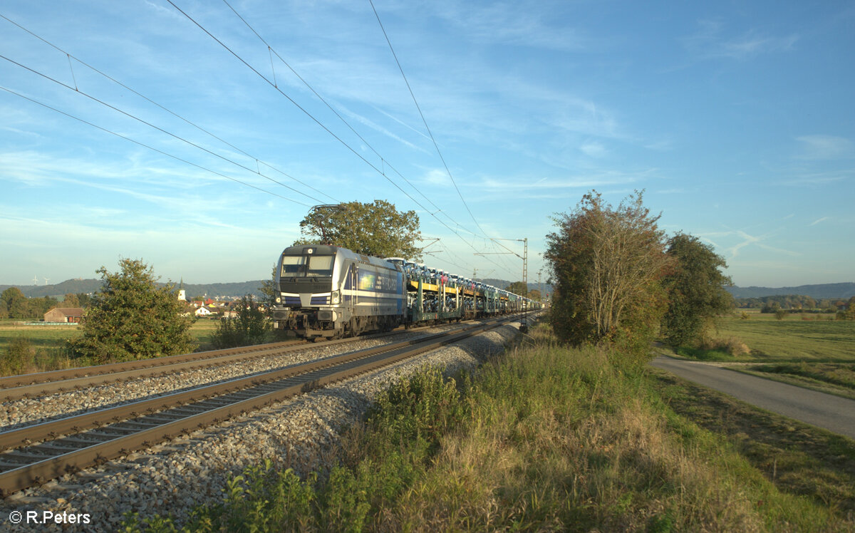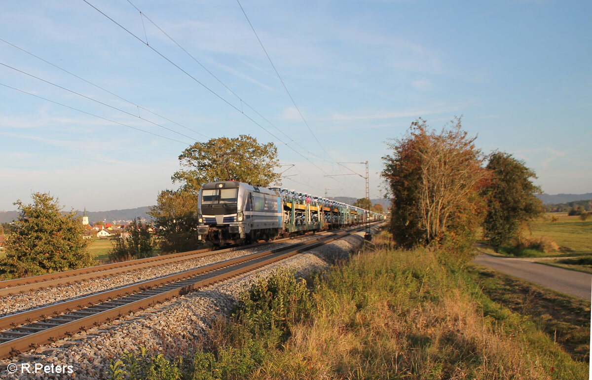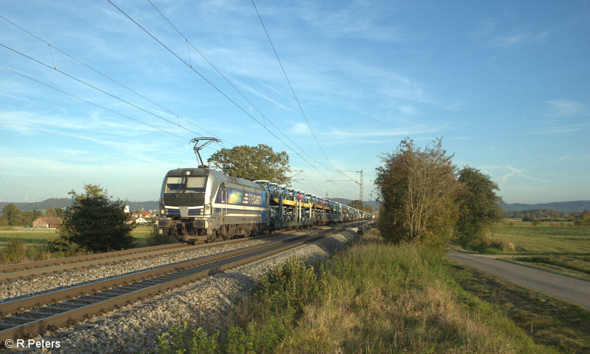 193 999-0 "Györ" zieht bei Pölling mit einem offenen ARS Altmann Autotransportzug in Richtung Norden. 17.10.24