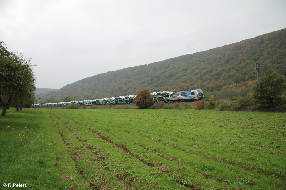 6193 999-0  Györ  der RTB Cargo zieht mit einem offenen Autotransportzug bei Wernfeld in Richtung Norden. 20.10.24