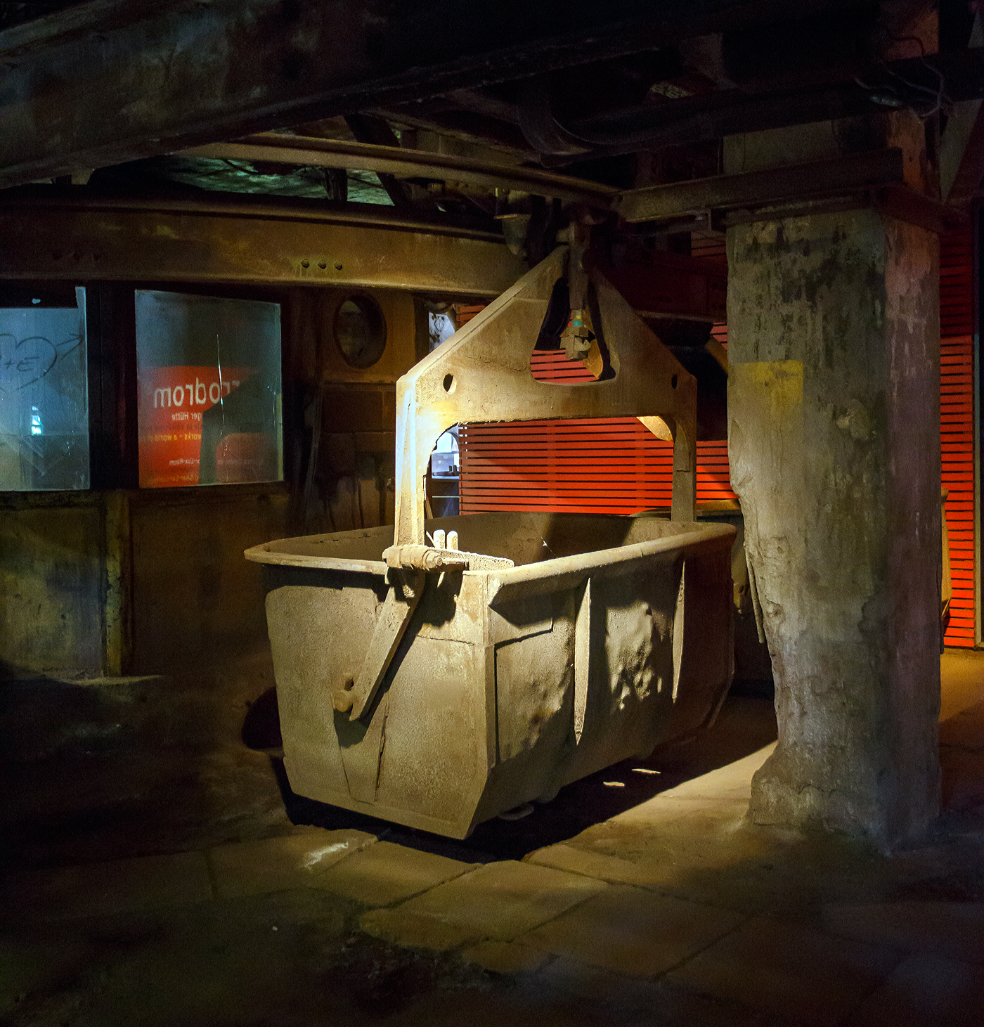 Am Tiefbunker (Rohstoffentladebunker der Sinterhalle) der Völklinger Hütte (ehem. Röchling'schen Eisen- und Stahlwerke GmbH in Völklingen/Saar, ab 1982 ARBED-Saarstahl GmbH, ab 1986 Saarstahl Völklingen GmbH) hinter der Normalspur-Denkmallok 34 stehen zwei vierachsige offene Schüttgutwagen (Sattelwagen) mit schlagartiger Schwerkraftentladung, hydraulischem Klappenverschlusssystem vermutlich der Gattung Falns (genaue Bezeichnungen kann man nicht erkennen), hier am 01 Juli 2025. Die Darstellung steht für den Rohstofftransport der Hütte zur Herstellung des Sintergutes. Die Lok war auch auf Bundesbahn Gleisen zugelassen. Heutiger Eigentümer der Lok und Wagen ist die Initiative Völklinger Hütte e.V..