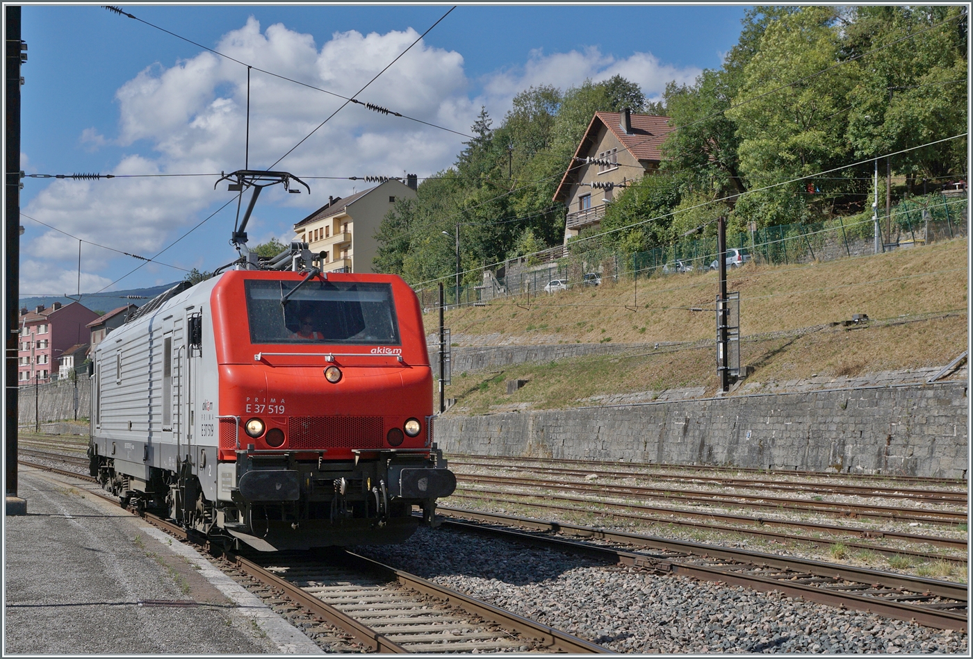 Die akiem PRIMA E 37 519 erreicht als Lokfahrt den Bahnhof von Bellegarde. Die Lok wird wohl in Thonon bzw. Evian einen Mineralwasserzug abholen. Ein Blick auf die Fahrleitung zeigt, dass diese auf den Nebengleisen mit nur einem Fahrdraht und ohne Tragseil sehr einfach konstruiert ist.