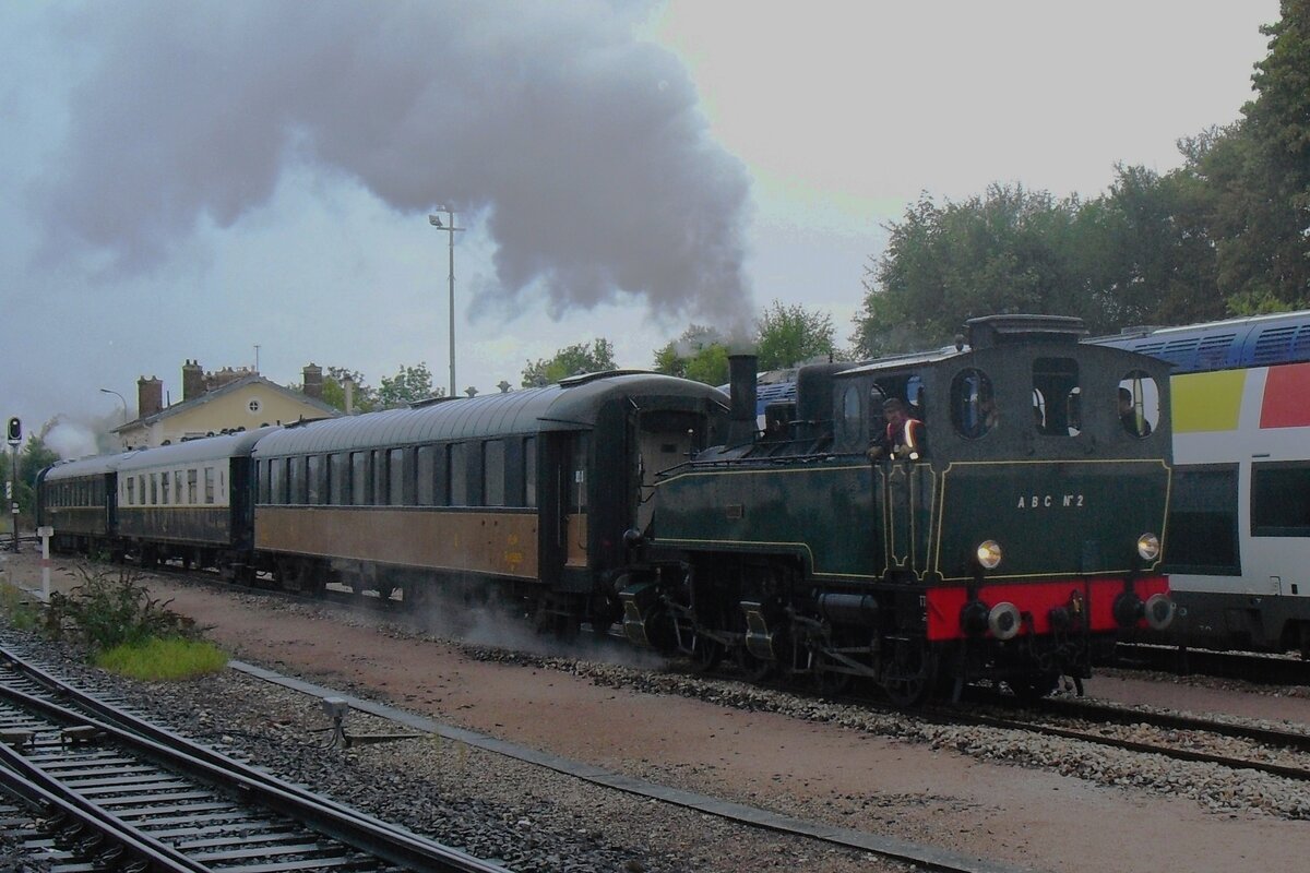 Eine Gast in Longueville am 18 September 2011 anlasslich das 100.Jahresjubiläum der Lokschuppen war A.B.C.-2/020+020 Mallet 10416 der Train Thur Dollar Alsace. Hier zieht sie ein Dampfpendelzug aud Longueville nach Provins. Leon Schrijvers