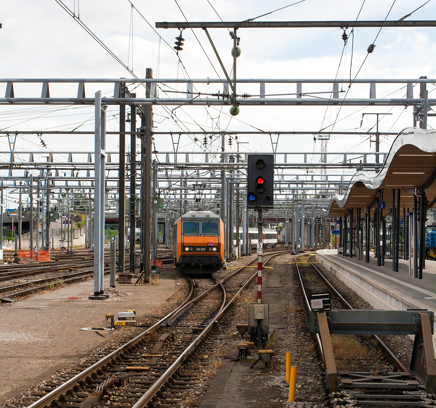 Der SBB RABe 511 110 nach St-Maurice erreicht Lancy Pont Rouge, während im Güter- bzw. Rangierbahnhof Genève La Praille gleich gegenüber die SNCF BB 26211 wartet.