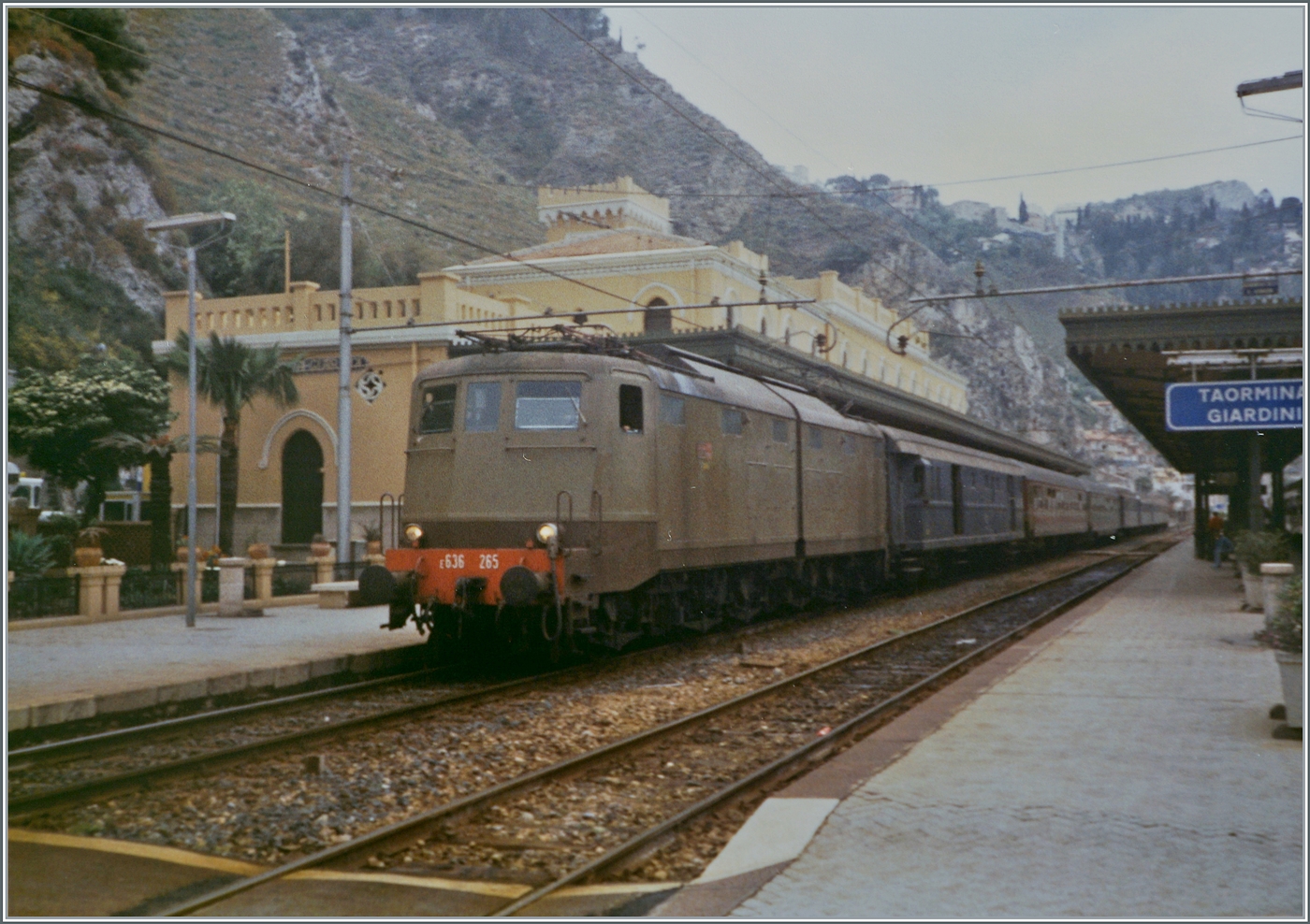Kein schönes Bild aber eine herrliche Aussicht auf die Strecke bei Taormina-Giardini, wobei im Hintergrund sogar noch der Bahnhof von Taormina-Giardini zu erkennen ist.