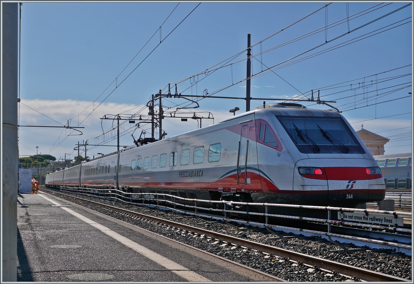 Mit einem Steuerwagen an der Spitze erreicht der FS Trenitalia interCity iC 501 von Sestri Levante nach Napoli den Bahnhof von Civitavecchia.
