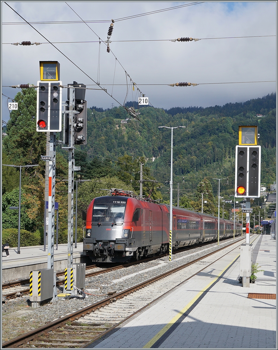 Die ÖBB 1116 245 wartet mit einem RJ in der Zugsausgangsstation von Bregenz auf die Abfahrt nach Wien Flughafen.