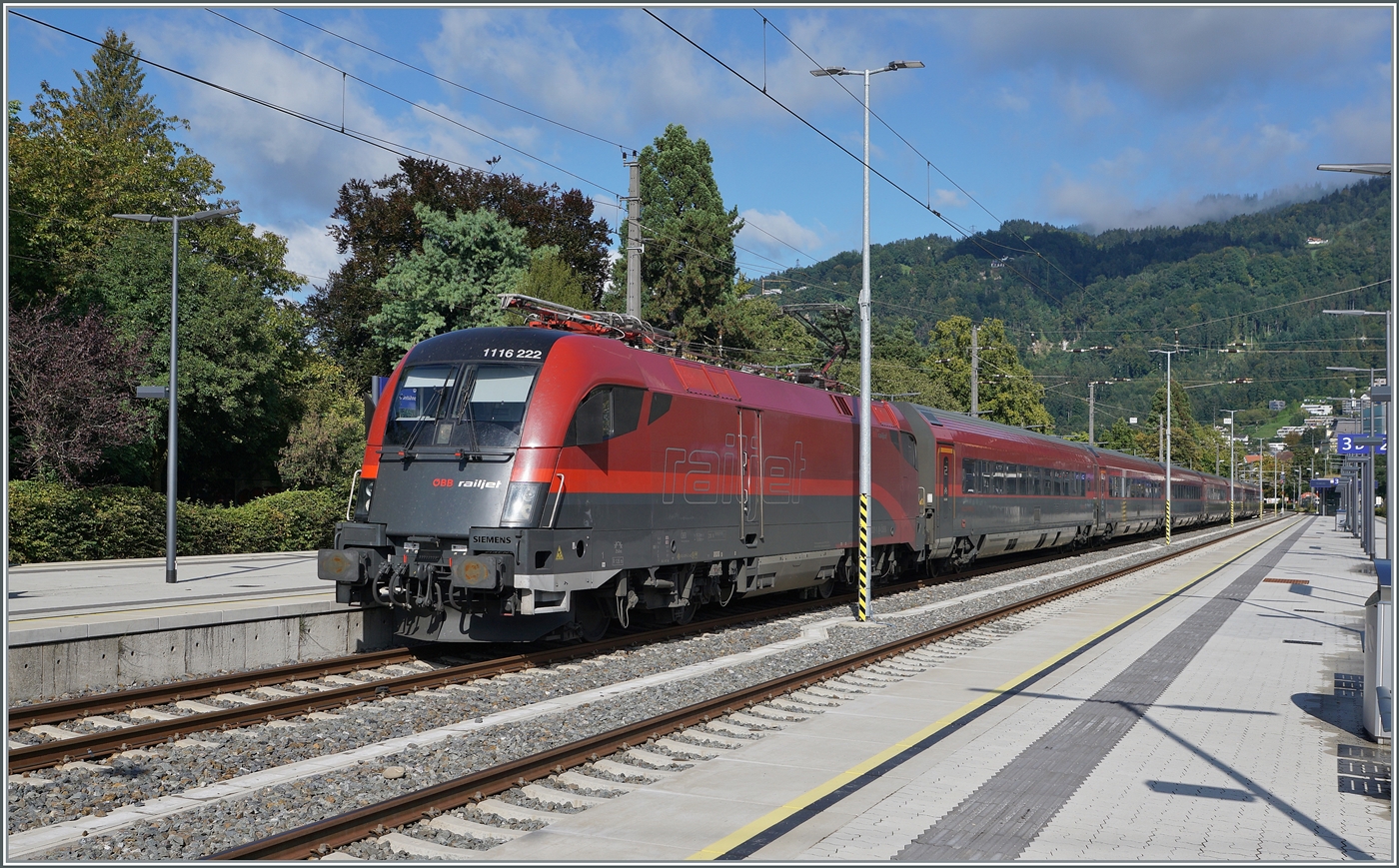 Die ÖBB 1116 098 rangiert mit ihrem RJ im Bahnhof von Bregenz. 15. Sept. 2024