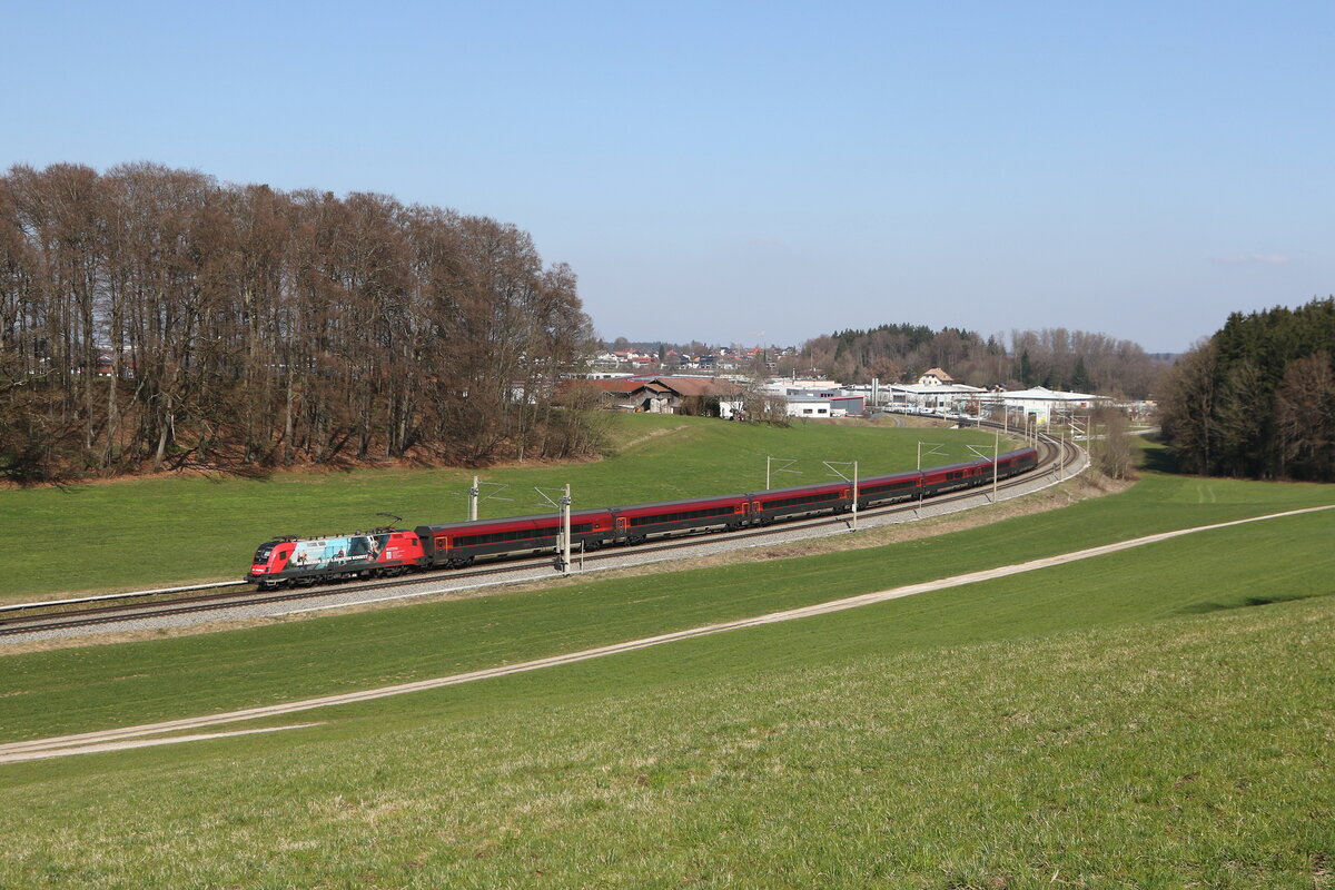 1116 208 mit einer Doppel-Railjet-Garnitur am 7. Mai 2019 kurz nach Prien am Chiemsee.