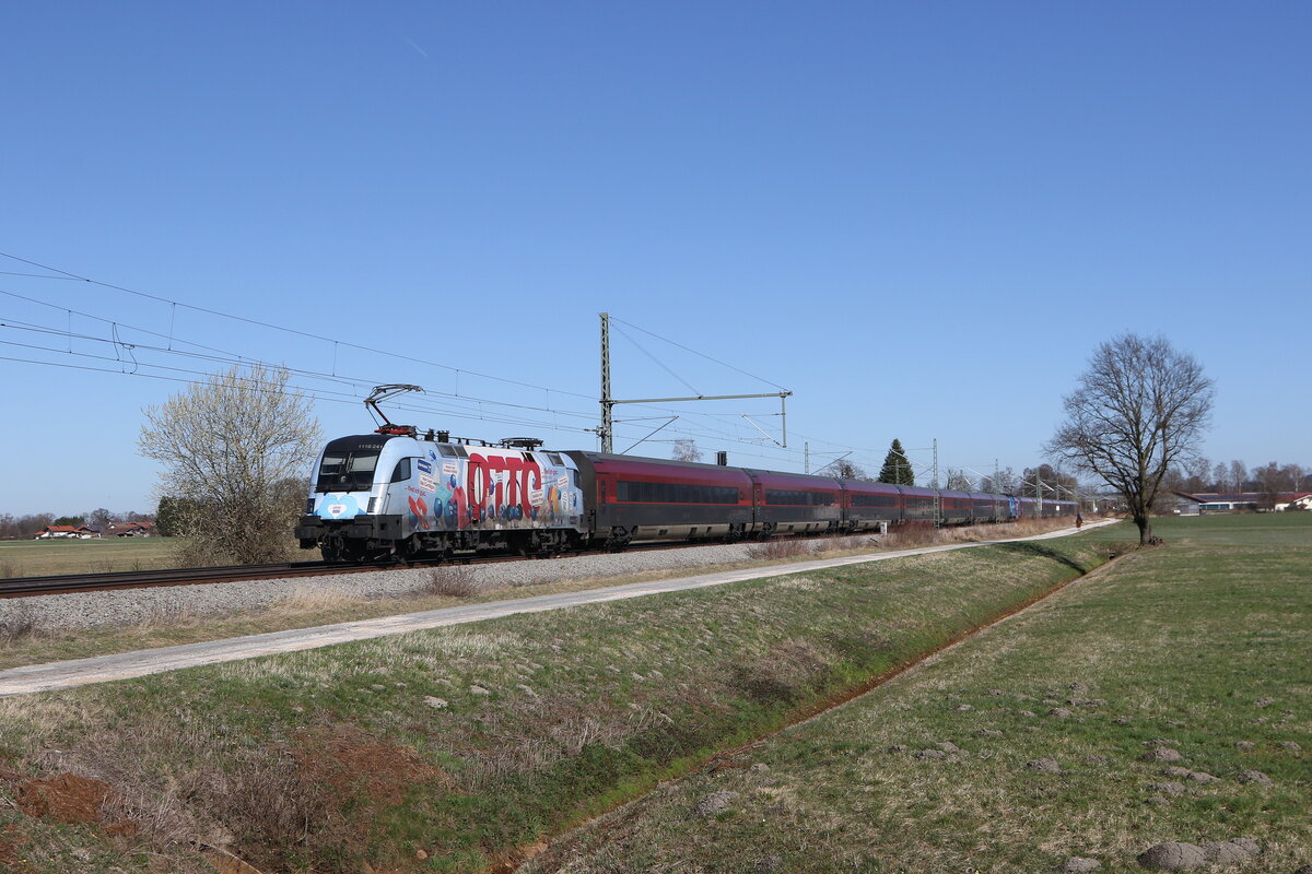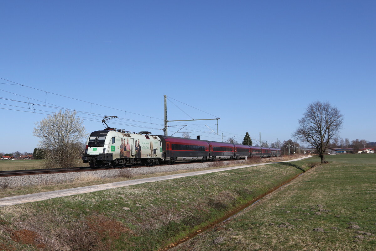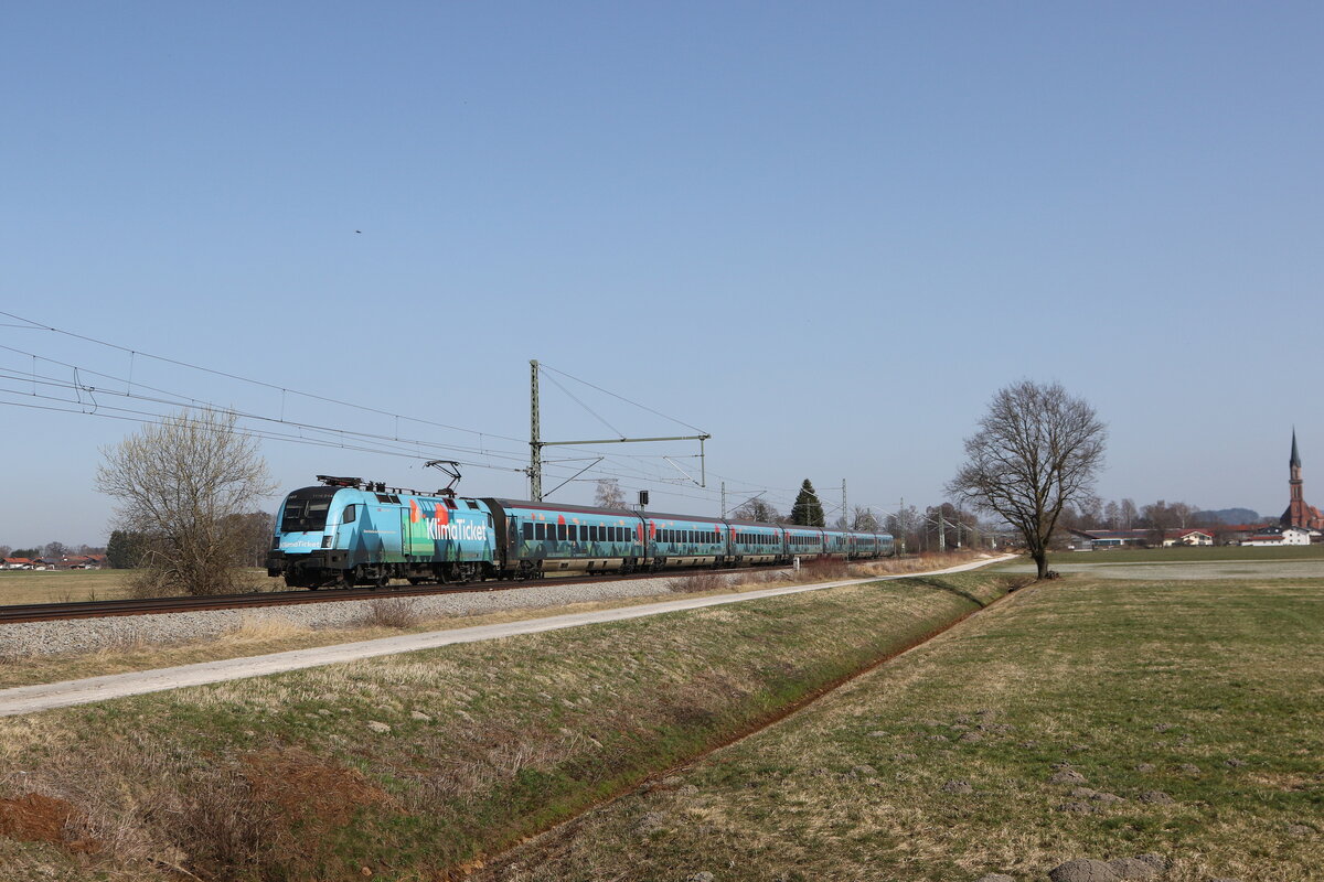 1116 182 "Unser Heer" war am 19. Januar 2022 als Hilfslok an einem "Railjet" im Einsatz. Bei Grabenstätt im Chiemgau schob sie den "Railjet" in Richtung Salzburg.