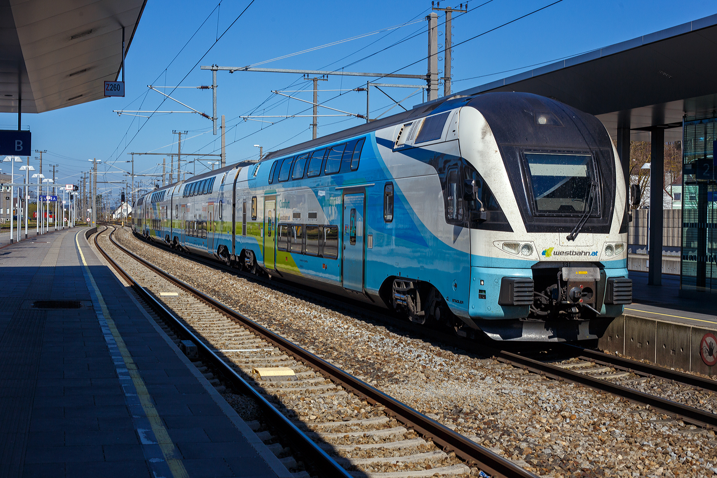 Die Stadler Eea 936 133-8 fährt mit einem sechsteiligen Westbahn "Kiss 2" auf dem Weg in Richtung St. Margrethen in Rheineck durch.