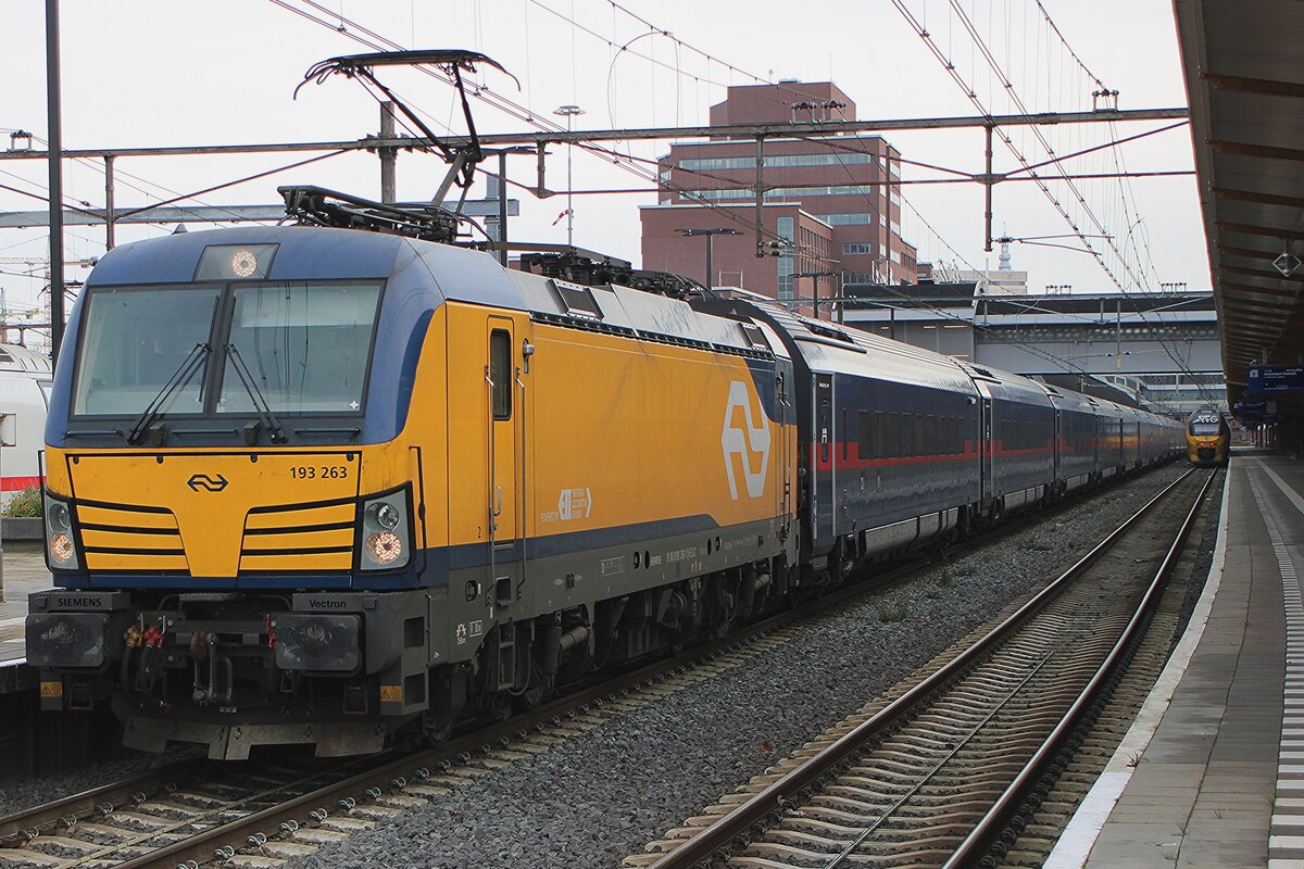 NS 193 263 steht mit ein 2,5 Stunde verspäteter NightJet aus Innsbruck am 22 November 2025 in Amersfoort.