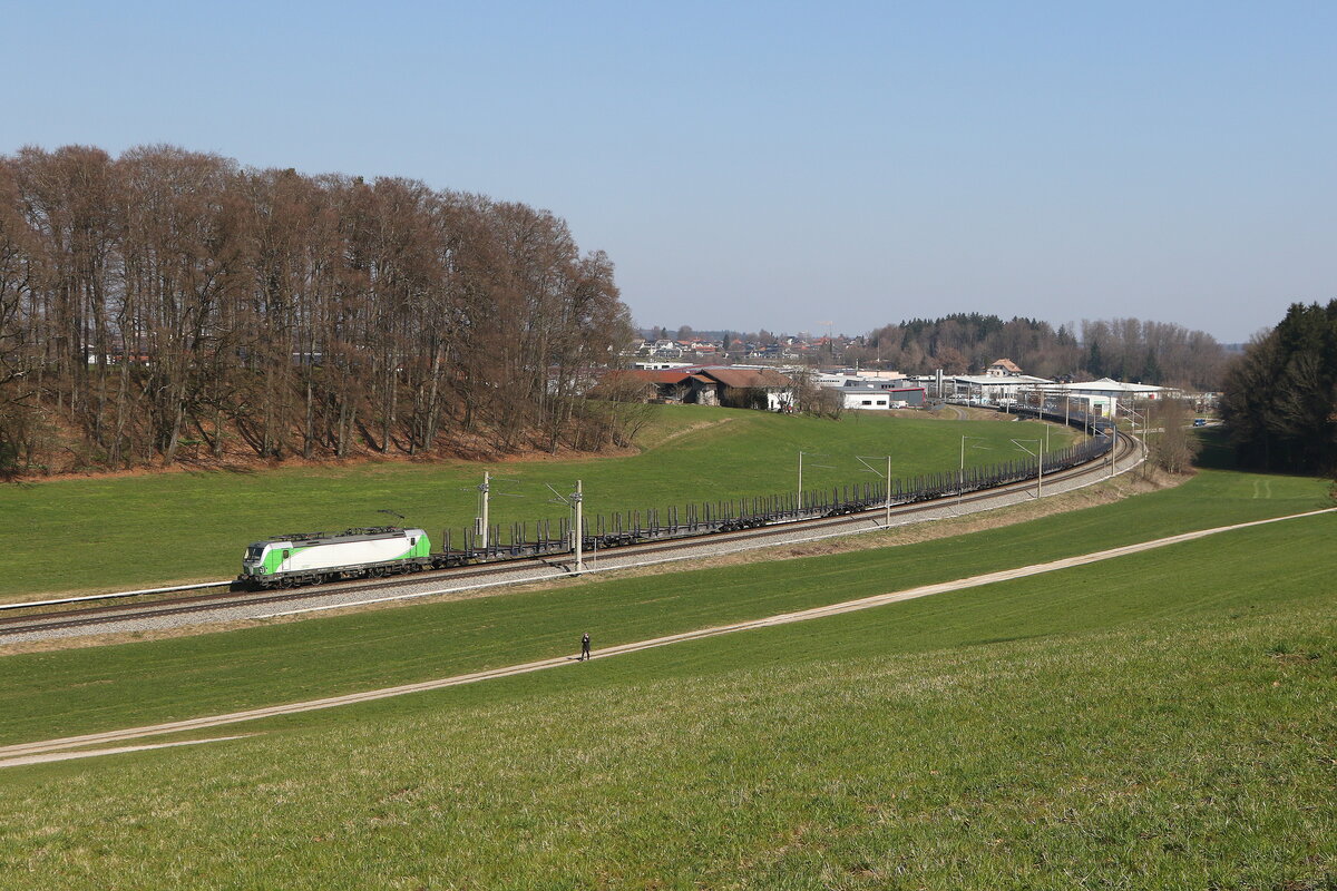 193 814 war am 7. Mai 2019 mit einem Kesselwagenzug bei Prien am Chiemsee in Richtung Salzburg unterwegs.