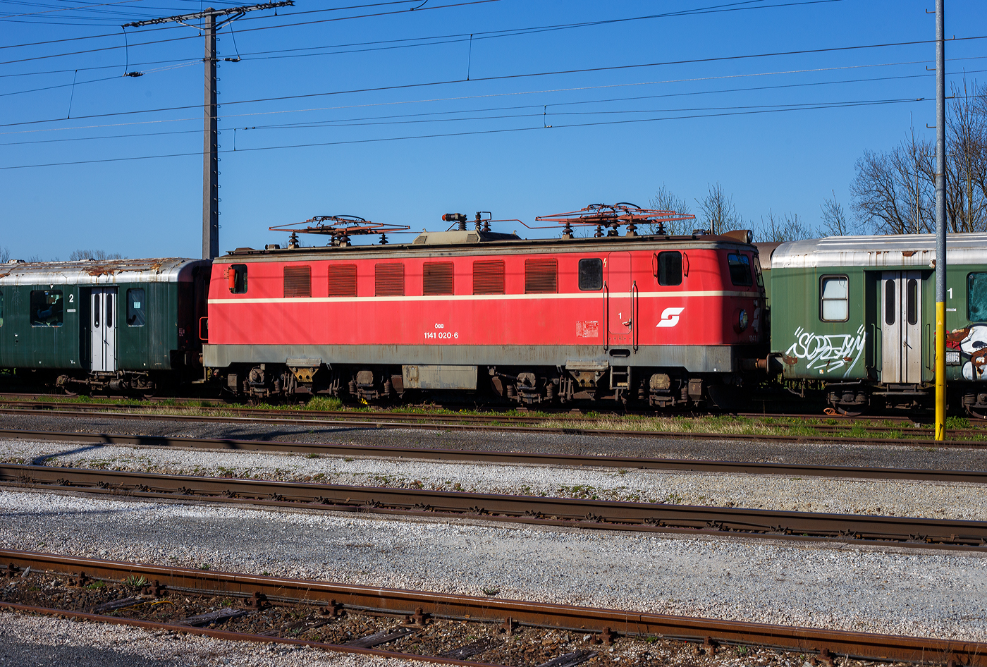 Der ex ÖBB Schlierenwagen der 2. Klasse Großraumwagen mit Mehrzweckabteil noch in Tannengrün, 50 81 84-33 049-8 BDp-l der ÖGEG - Österreichische Gesellschaft für Eisenbahngeschichte GmbH ist am 14 Januar 2025 beim Bahnhof Timelkam abgestellt. Bild leider nur aus einem Zug, hätten wir gewusst was hier alles herumsteht, dann hätten wir einen Stopp eingelegt.