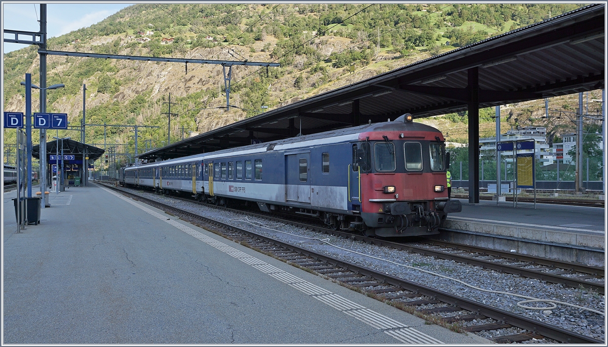 Baubedingte Sperrung der Simplonstrecke zwischen Iselle und Domodossola: Die SBB Re 4/4 II 11161 wartet mit ihrem IR in Brig auf die Abfahrt nach Iselle, wo dann auf einen Autobus umgestiegen werden muss) Der Zug besteht aus folgenden Reisezugwagen: A 50 85 18 35 028-1, B 5085 20 35 265-1, B 50 85 20 316-2 und dem BDt 50 85 82 33 923-2 an der Zugsspitze.