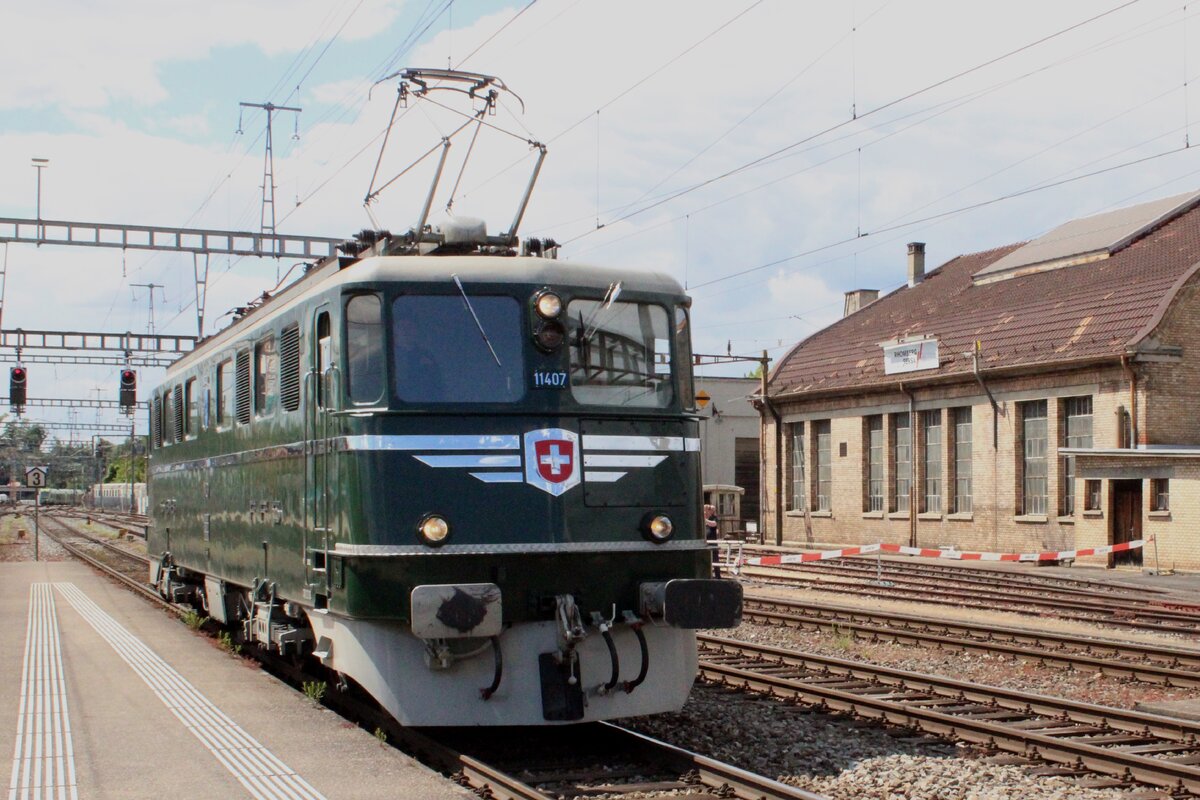 Ex-SBB 11407 steht mit ein Extrazug abfahrtbereit in BUrgdorf am 17 Mai 2025.