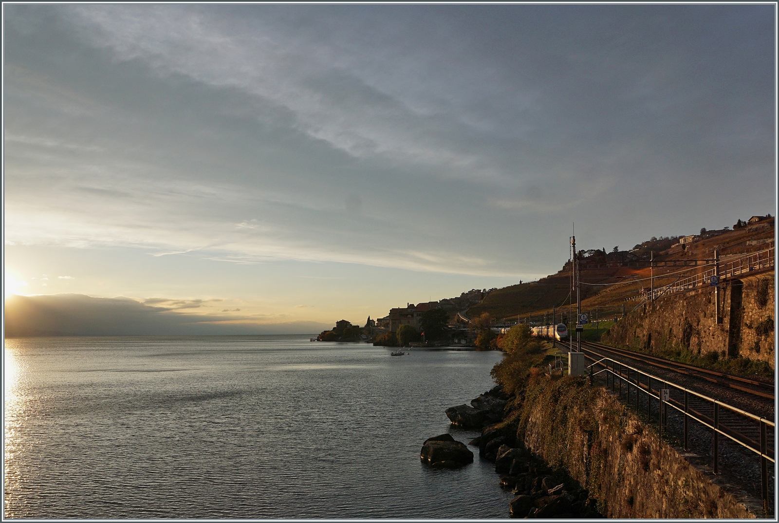 In der von der hinter meinem Rücken langsam untergehend Sonne schon etwas rot gefärbten Landschaft des Lavaux ist die SBB Re 4/4 II 11294 (Re 420 294-1) "100 Jahre Zirkus Knie" mit einem Güterzug auf dem Weg in Richtung Lausanne. 15. November 2024