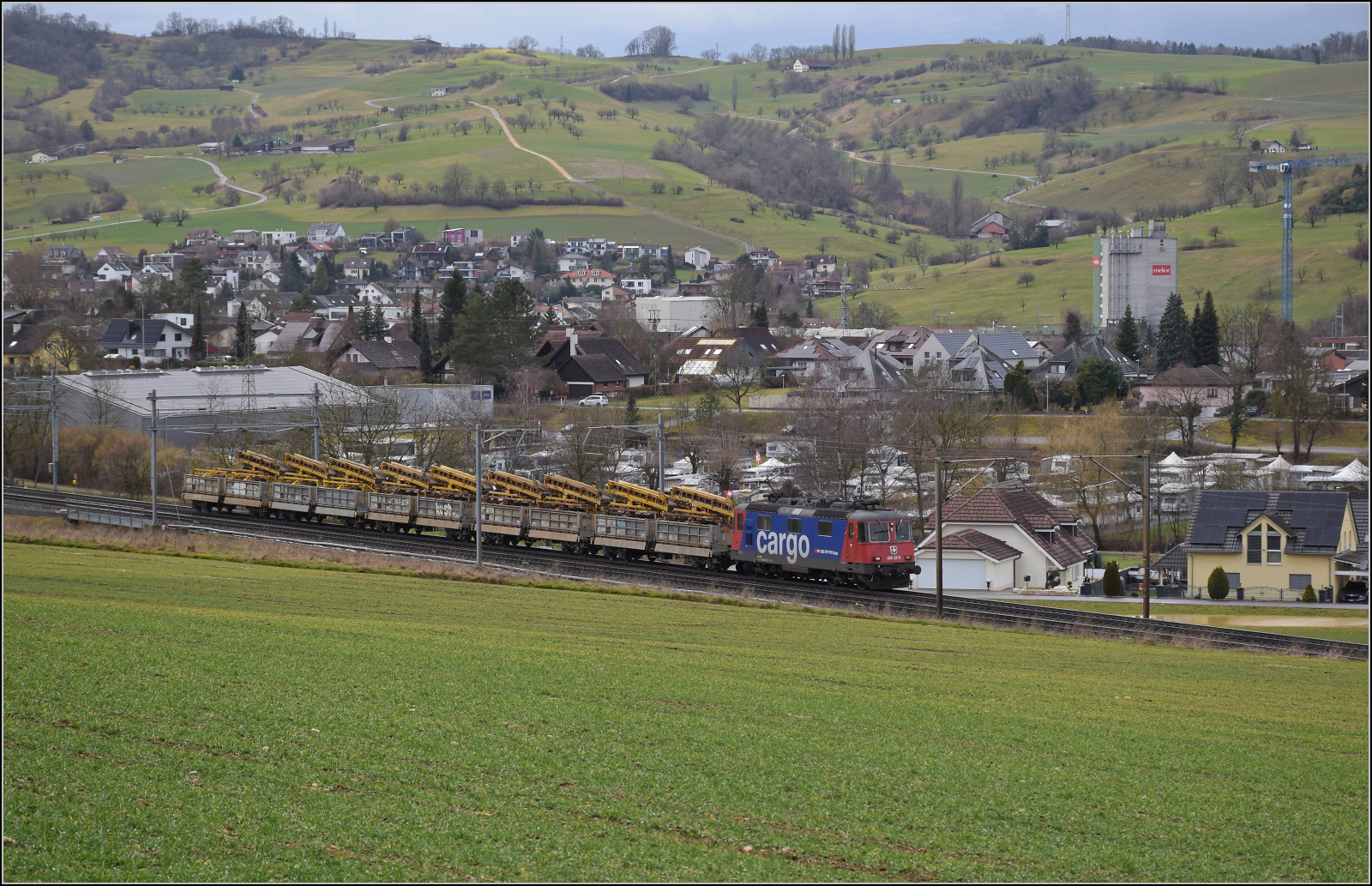 Re 421 373 der WRS ist solo auf dem Weg zum Bözberg. Dabei kommt die Lok an einer veritablen Havariestelle vorbei. Denn bei der ungünstigen Abschleppaktion mit dem geöffneten Muldenkipper kam die Sache ruckartig in Bewegung, wegen der Schräglage spritzte plötzlich das Hydrauliköl in einer Wolke aus dem Hydraulikzylinder, die Mulde rauschte nach unten. Ein Knall und der Schlag des Aufpralls der Mulde auf den Sattel des LKWs kamen kurze Zeit später an. Mein ungutes Gefühl, die werden doch nicht..., hat sich bestätigt. Schräglage und eine ruckartige Befreiung aus den selbstgegrabenen Löchern sind eben doch zu viel, selbst für die beste Hebehydraulik. Für die niedrige Bahnbrücke mussten nun die noch verbliebenen Hydraulikzylinder noch aus dem Weg und die festsitzende Heckklappe runtergeklappt werden. Anschließend die instabile Mulde gesichert werden. Und wir sitzen auch im Superschlechtwetter fest. Februar 2026.