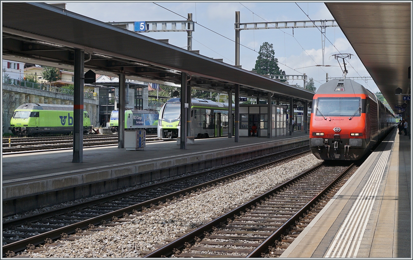 Zwischen Rivaz und St-Saphorin ist eine SBB Re 460 mit einem IR auf dem Weg ins Richtung Wallis.