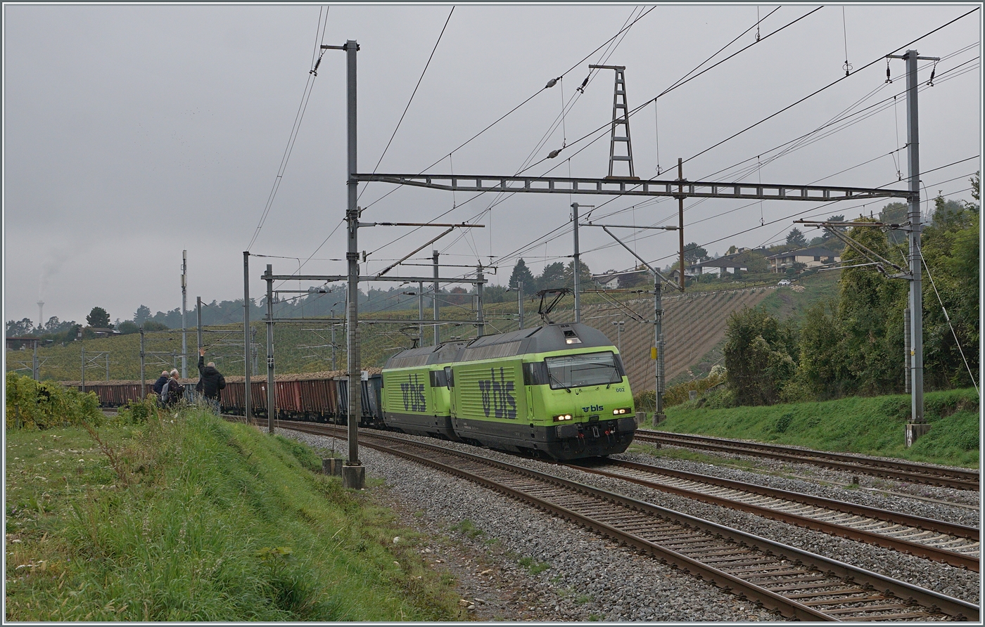 Die BLS Re 460 001 ist mit einer weiteren mit einem Güterzug in Richtung Süden bei Mülenen unterwegs.
