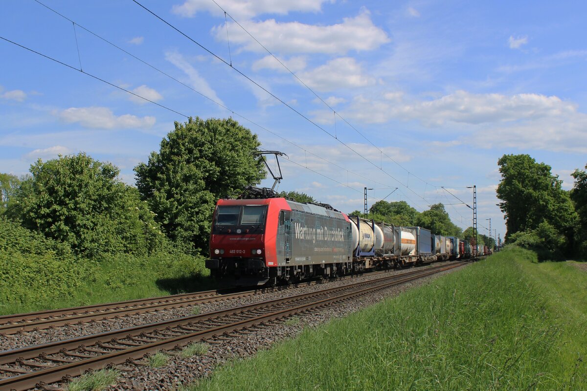 SBB Cargo 482 012 "wartet mit Durchblick" am 8 Mai 2025 während der Passage durch Kaarst-Broicherseite und wird vom offenbarer Füsspfad fotografiert.