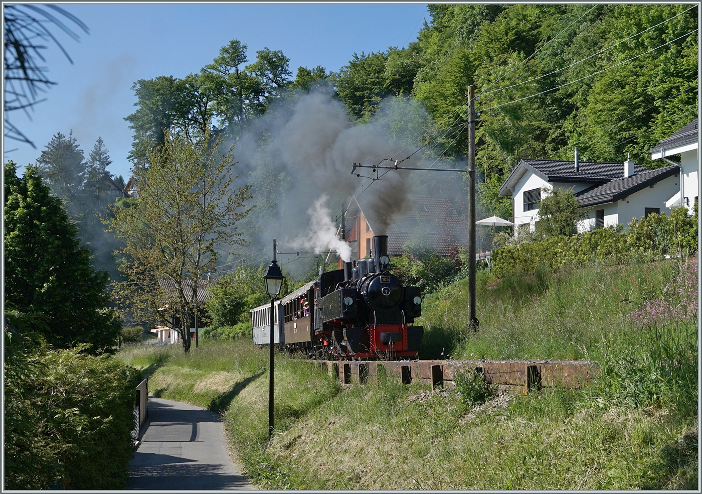 Die Front der in Blonay abgestellte MOB GDe 4/4 6006 bietet einen schönen Hintergrund zum einfahrenden MOB BCFe 4/4 N° 11 der Blonay Chamby Bahn, der mit dem letzten Zug des Tages in den Bahnhof einfährt.