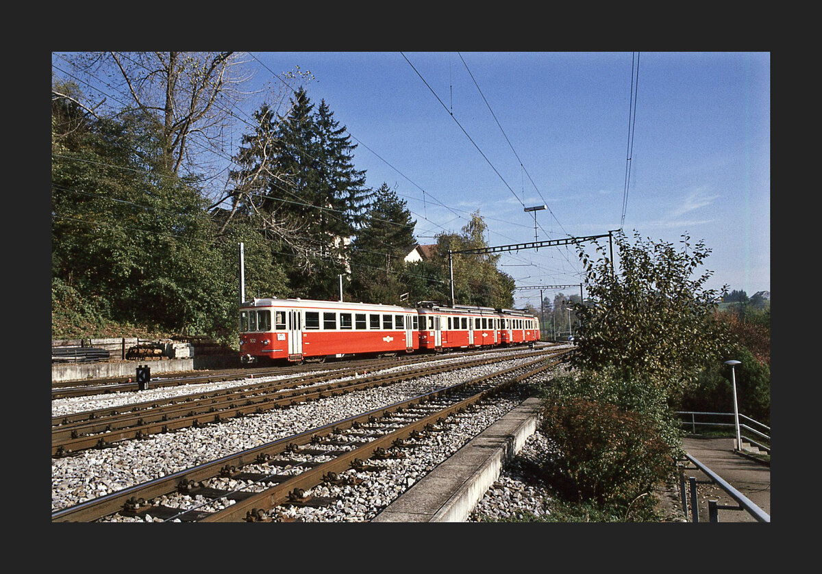 Vierachswagen der Forchbahn auf der Forch. Steuerwagen Bt 102 vor den beiden Triebwagen 15 und 16 - (unsichtbar Bt 104). 26.Oktober 1995 Peter Ackermann