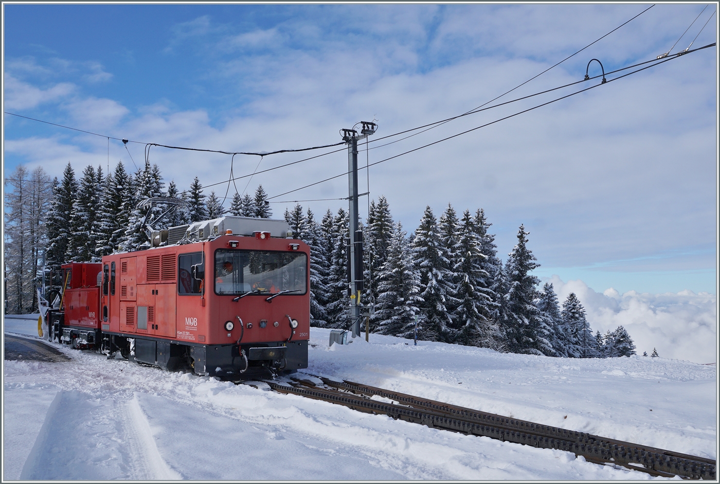 Winter in Blonay. Der "Tains des Etoiles" wartet auf die Abfahrt Richtung Les Pléiades.
