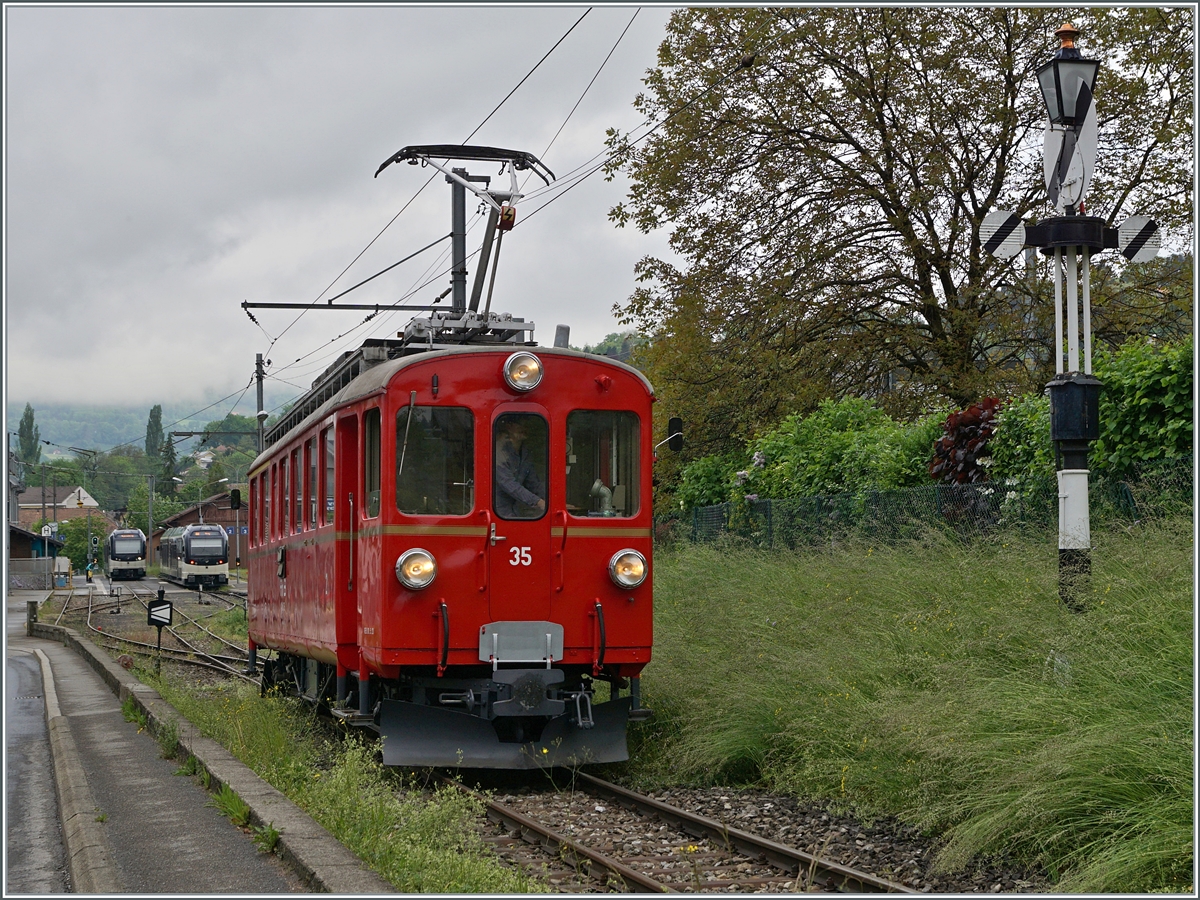 Die Blonay-Chamby +GF+ Ge 4/4 75 erreicht mit ihrem Reisezug von Blonay bei Kilometer 8.7 (von Vevey gerechnet) Chamby, wo rechts im Bild ansatzweise zu erkenne Anschluss an die MOB Strecke Montreux Zweisimmen besteht.