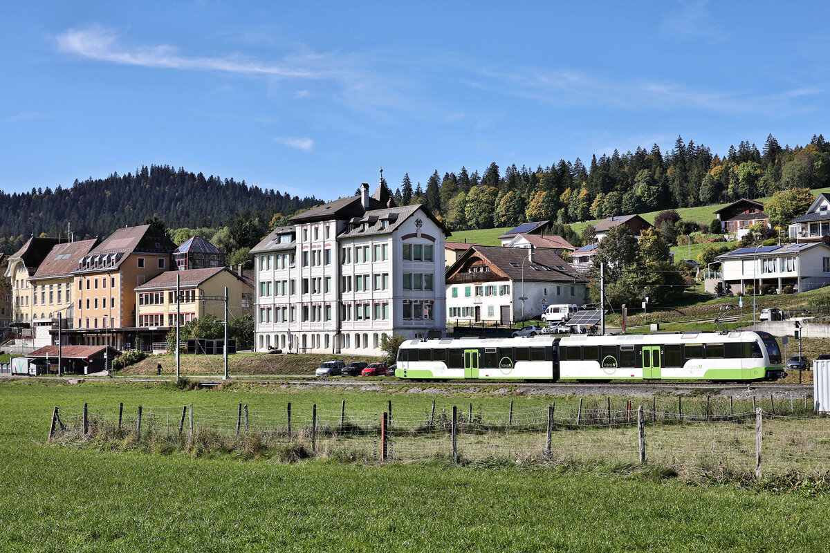 Kreuzung in La Sagne, TRN: Der neue Doppeltriebwagen ABe4/8 9 fährt von La Chaux-de-Fonds her unter dem markanten Schulhaus in die Haltestelle La Sagne ein. 7.Oktober 2025 Peter Ackermann