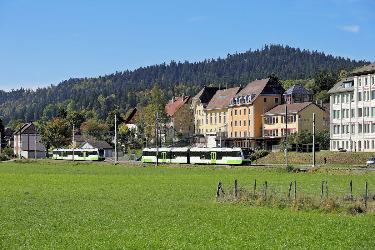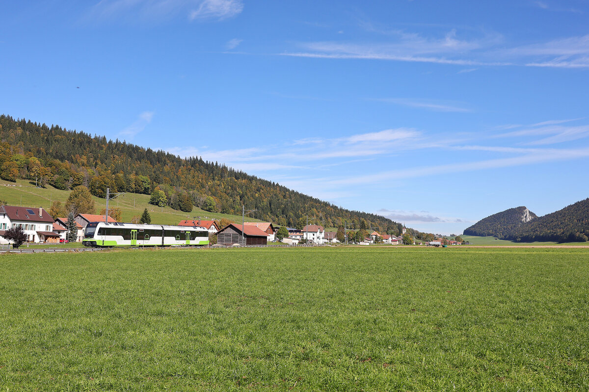 Kreuzung in La Sagne, TRN: Nach der Kreuzung fährt nun Triebwagen 10 durchs Tal mit seiner markanten Bergkulisse Richtung La Chaux-de-Fonds. 7.Oktober 2025 Peter Ackermann