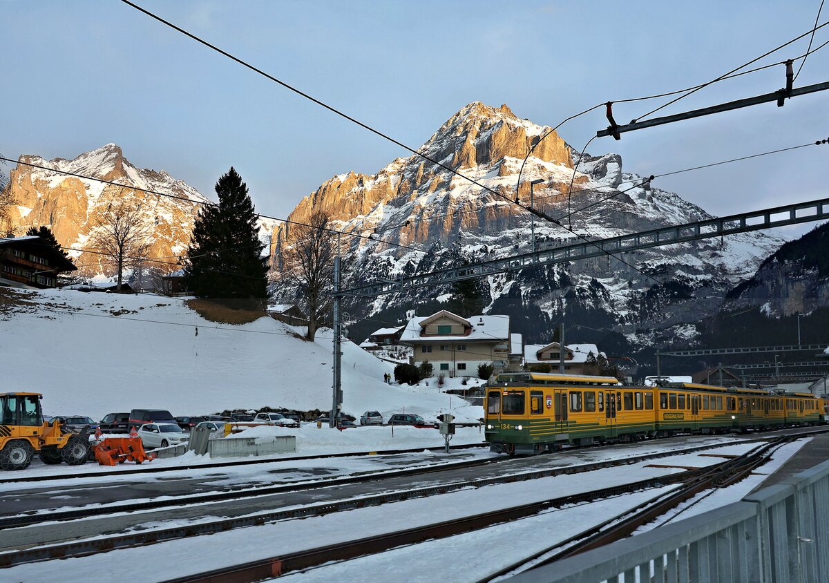 Seit der Eröffnung der Luftseilbahn Grindelwald Grund - Eigergletscher sind auf der WAB nur noch wenige Züge auf der Seite Grindelwald unterwegs. Meist sind es nur noch 3 Züge, wovon zwei Doppeltriebwagen+Doppeltriebwagen+Gelenksteuerwagen. Hier fährt im letzten Abendlicht der Zug Doppeltriebwagen 134+132+Gelenksteuerwagen 252 in Grindelwald Grund ein. 4.Februar 2026 Peter Ackermann