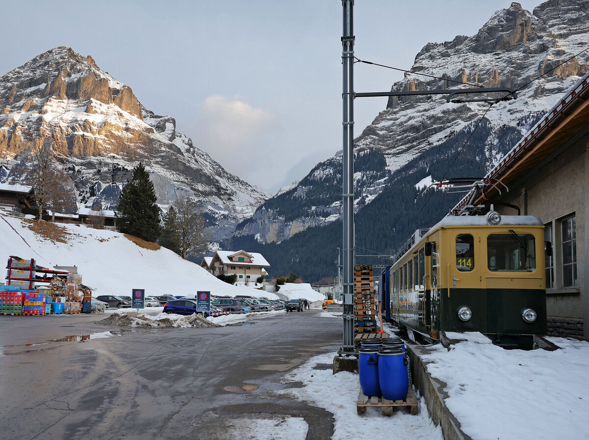 Von den klassischen Triebwagen der WAB existieren jetzt nur noch ganz wenige. Hier steht Triebwagen 114 mit dem Güterzug der Strecke Grindelwald-Kl. Scheidegg in Grindelwald Grund bereit. Der Triebwagen wurde (mit Einholm-Stromabnehmer) 1986 nach seinem schrecklichen Lawinenunglück neu aufgebaut. 4.Februar 2026 Peter Ackermann