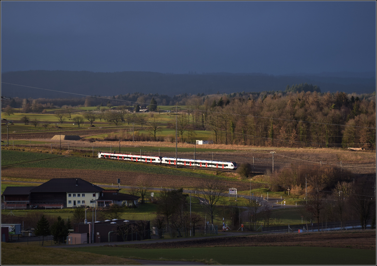 Hier gibt's Saures - pardon Buntes für eine Dreifachtraktion Flirt aus RABe 521, RABe 523 und RABe 521. Mumpf, Januar 2026. Olli