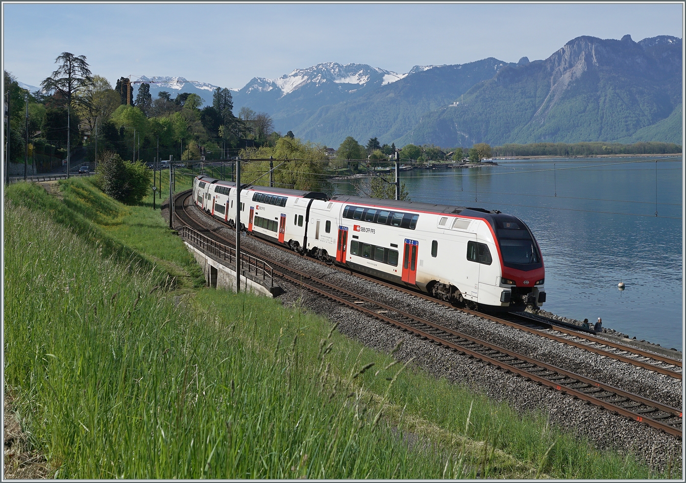 Der sechsteilige SBB Dosto RABe 511 020, erreicht als RE von St-Maurice nach Annemasse pünktlich den Bahnhof.