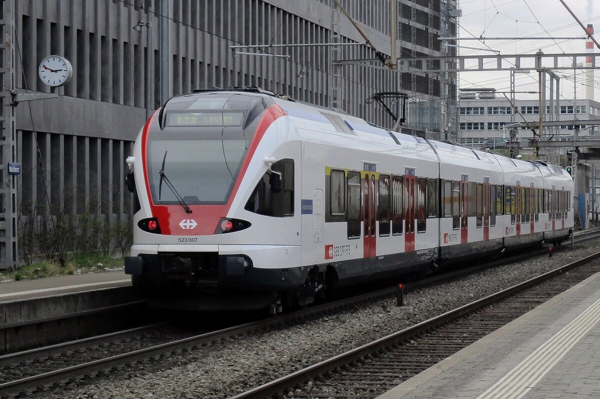Ein SBB Flirt RABe 523 ist bei Rivaz auf dem Weg nach Lausanne.