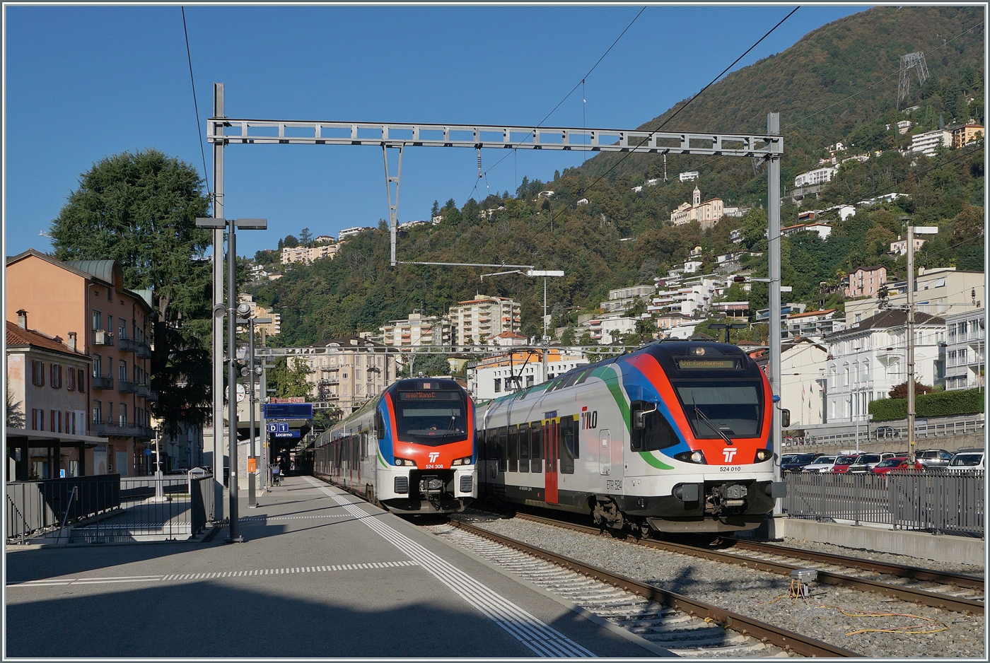 In Domodossola treffen sich der SBB TILO RABe 524 102 (UIC 94 85 0 524 012-7 CH-FFS) und der Trenord ETR 421.
