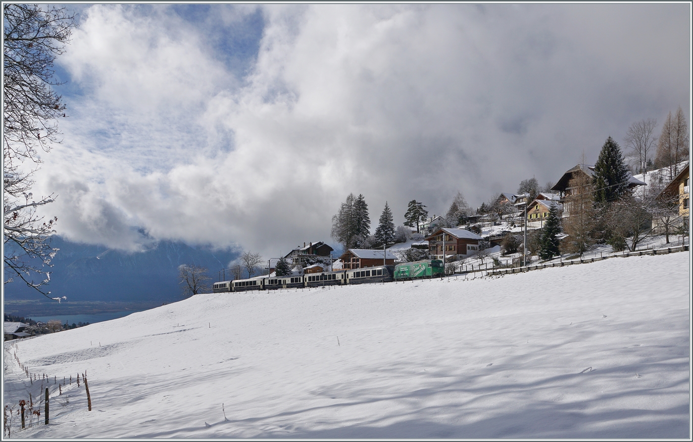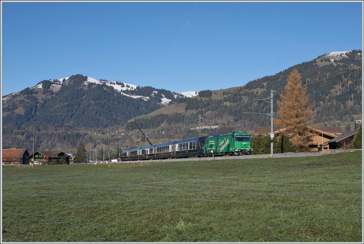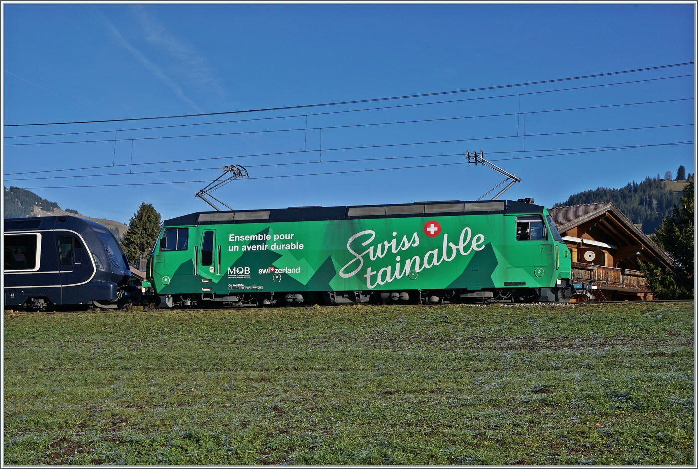 Die MOB Ge 4/4 8001 ist mit dem GoldenPass Express GPX 4064 in Montbovon auf dem Weg nach Interlaken Ost. Rechts im Bild ein TPF SURF nach Palézieux.