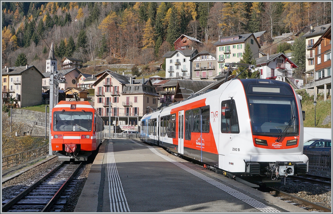 Das enge Tal weitet sich bei Bovernier etwas, so dass an den steilen Hänge sogar Wein angepflanzt werden kann. Ein TMR Region Alpes RABe 525 ist von Le Châble nach Martigny unterwegs und wird in Kürze Bovernier erreichen.