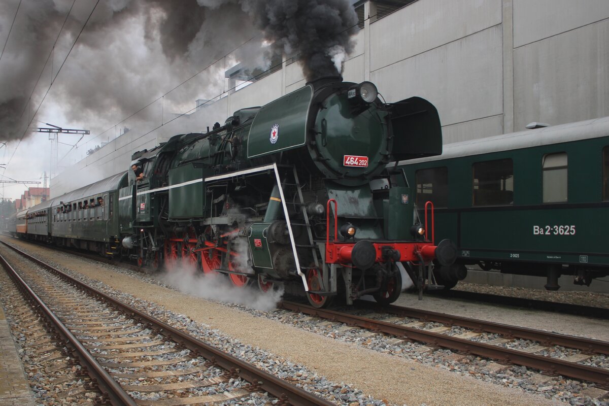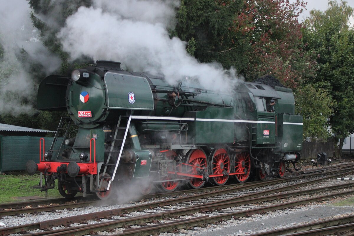 Pause für Laubfrosch 464 202 in Luzna u Rakovnika am 11 Mai 2024 -sie ist gerade mity ein Sonderzug aus Praha eingefahren und bekommt Kohle und Wasser für einige Dampffahrten.
