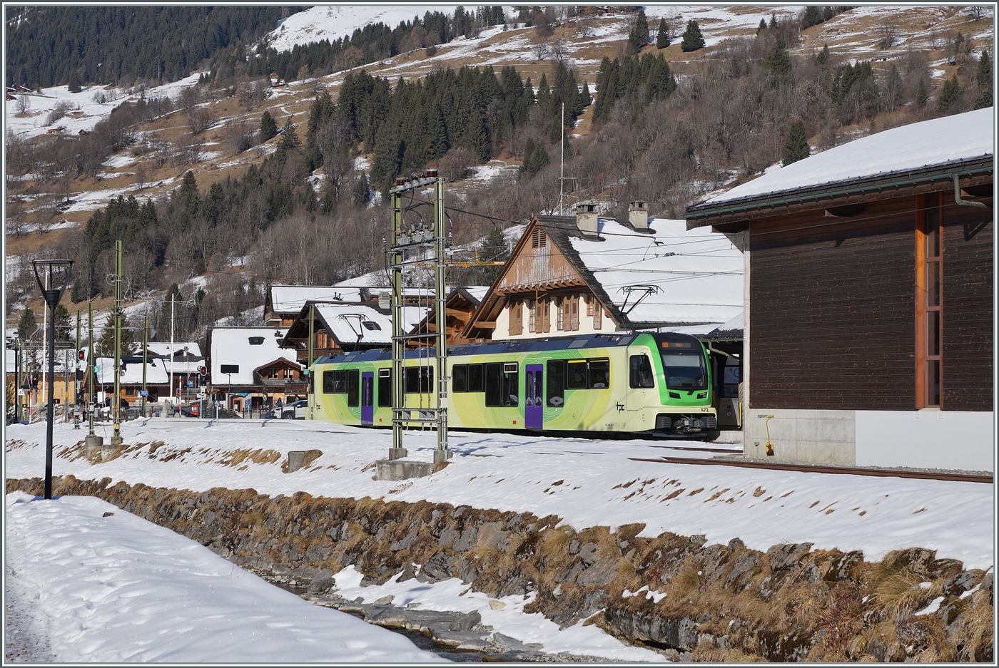 In Les Diablerets wartet der moderne TPC ABe 4/8 472 als Regionalzug 71 435 nach Aigle auf die Abfahrt.